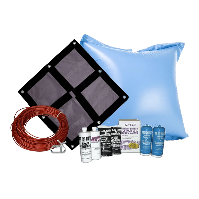 Emperor solid winter cover for 12′ round above ground pool with 4′ overlap. 8 mil thickness, black on tan triple laminated polyethylene with heat sealed seams for added strength. Edges incorporate a sewn-in polypropylene cord for reinforcement. Aluminum grommets spaced every three feet. Deluxe aluminum cable winch and vinyl coated steel lock-down cable included.