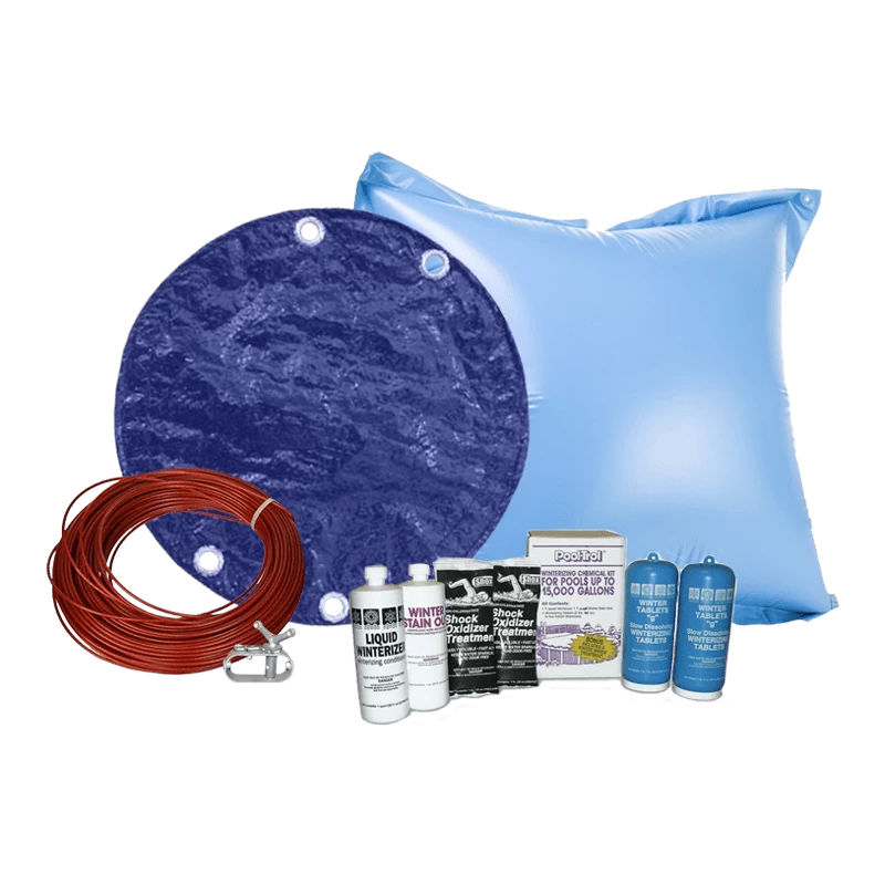 18′ Round Royal Solid Cover Bundle with 15k Chemical Kit and 4′ x 4′ Air Pillow. Above ground pool winter cover features 4′ overlap, 8 mil thickness, blue on black with triple laminated polyethylene and heat sealed seams for added strength. The edges incorporate a sewn-in polypropylene cord for added reinforcement. Aluminum grommets spaced every three feet. Deluxe aluminum cable winch and vinyl coated steel lock-down cable included.