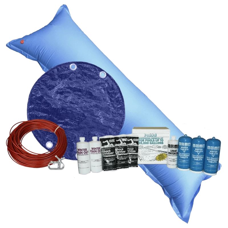 18’x34′ Oval Royal Solid Cover Bundle with 35k Chemical Kit and 4.5′ x 15′ Air Pillow. Above ground pool winter cover features 4′ overlap, 8 mil thickness, blue on black with triple laminated polyethylene and heat sealed seams for added strength. The edges incorporate a sewn-in polypropylene cord for added reinforcement. Aluminum grommets spaced every three feet. Deluxe aluminum cable winch and vinyl coated steel lock-down cable included.