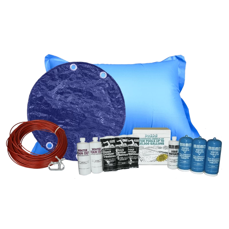 27′ Round Royal Solid Cover Bundle with 35k Chemical Kit and 4′ x 8′ Air Pillow. Above ground pool winter cover features 4′ overlap, 8 mil thickness, blue on black with triple laminated polyethylene and heat sealed seams for added strength. The edges incorporate a sewn-in polypropylene cord for added reinforcement. Aluminum grommets spaced every three feet. Deluxe aluminum cable winch and vinyl coated steel lock-down cable included.