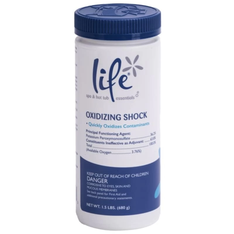 Life 47246490 1.5 lb Oxidizing Shock is a great option for shocking your spa without the use of chlorine. Our Oxidizing Shock is fast-acting, quickly dissolves, and helps to keep your hot tub clean. It also quickly oxidizes irritating contaminants.