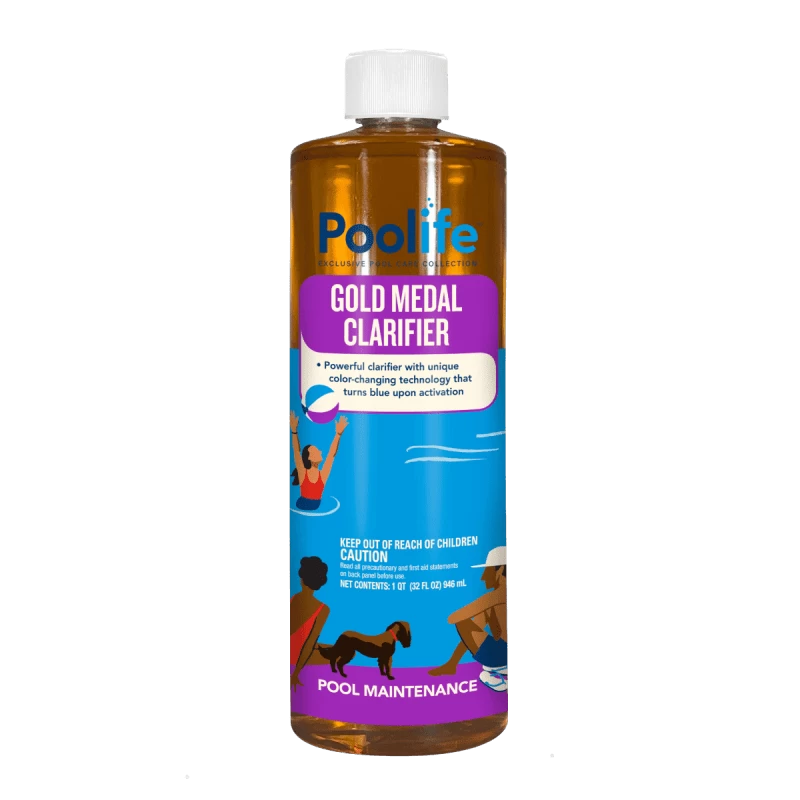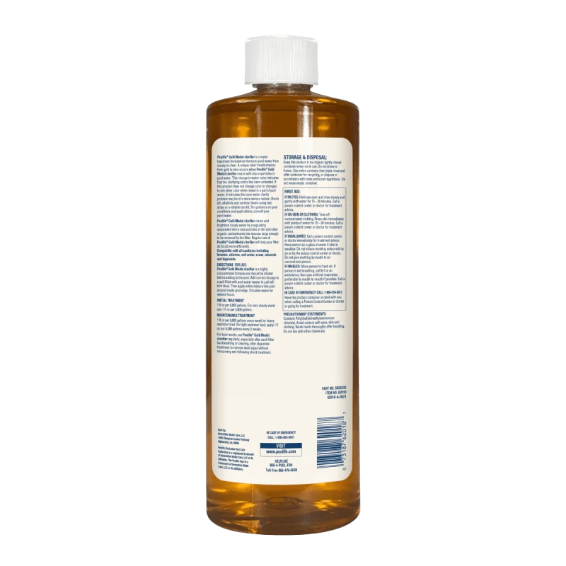 Poolife Gold Metal Clarifier is a highly concentrated clarifying formula and should be diluted before added to the pool. Add the correct clarifier dosage to a pail filled with pool water (water in pail will turn blue). Then apply entire clarifier mixture into pool around inside pool edge. Circulate water for several hours.
