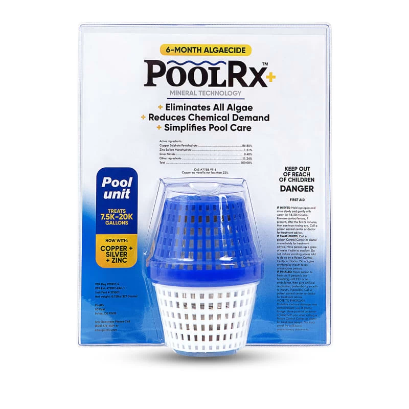 PoolRx+ contains a proprietary blend of minerals that continuously and effectively eliminate algae. The specially treated alloy cylinder is packed with PoolRx+ granular formulation. These minerals immediately dissolve out of the cylinder and form a stable residual throughout the pool water for up to 6 months. The minerals eliminate the algae while freeing up low levels of chlorine to be more active and productive in the water. During the pool’s filtration process the minerals are rejuvenated every time they return and pass through the cylinder. PoolRx+ works synergistically with a constant low level of chlorine.