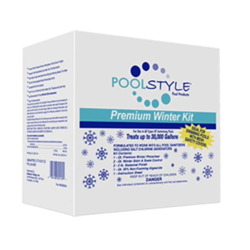 The chemicals contained in the Poolstyle Premium Winter Kit are formulated to treat up to 30,000 gallons of pool water to maintain clear water throughout the winter months and into the early Spring.