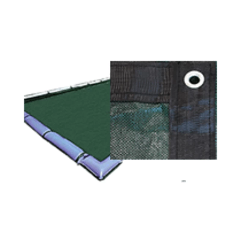 Mesh winter cover for 16′ x 32′ inground pool. Finely woven black polyethylene mesh allows water to pass through while trapping leaves; twigs and other debris.