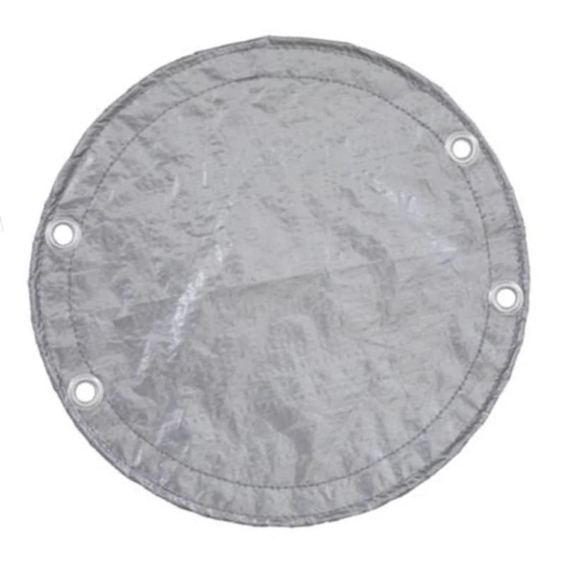 PoolTux King solid winter cover for 24′ round above ground pool with 4′ overlap. 8 mil thickness; silver on black triple laminated polyethylene with heat sealed seams for added strength. Aluminum grommets spaced every three feet. Deluxe aluminum cable winch and vinyl coated steel lock-down cable included.
